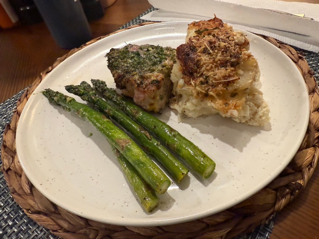 Herb crusted pork chops with scalloped potatoes and asparagus😊 Posted by William Herndon on June 15, 2025 Share this: Share on X (Opens in new window) X Share on Facebook (Opens in new window) Facebook Like Loading... Related